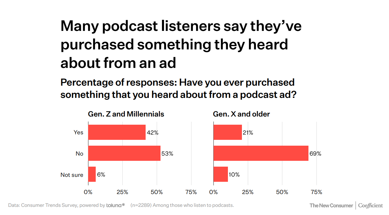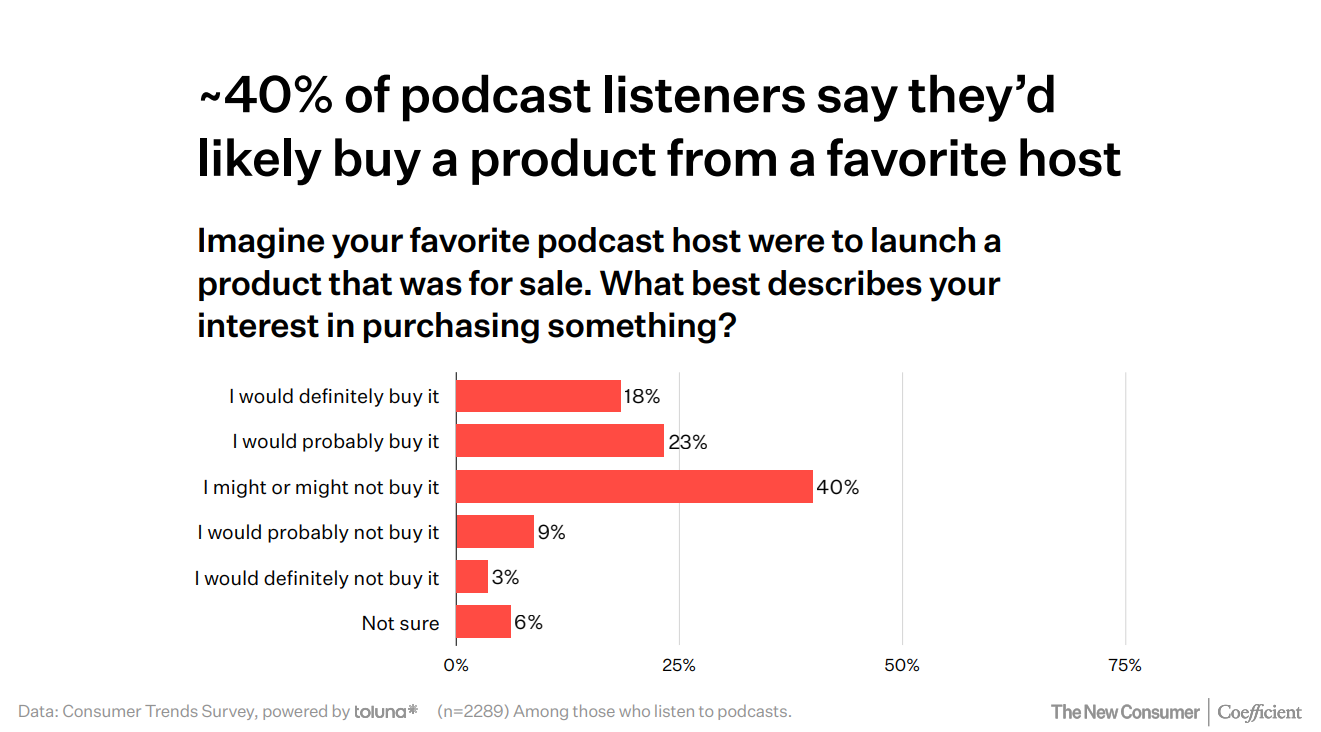 Half of Gen Z and Millennials purchased something because of a podcast ad, because someone they trust endorsed it. 40% would buy from their favorite podcast host. That’s distribution through trusted advocates who’ve already built trust for you.