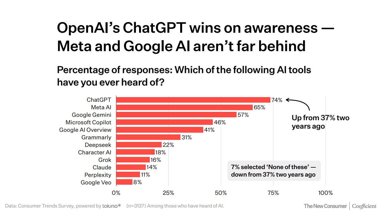 The findings pointed out that Meta AI has two-thirds awareness despite being functionally weaker than ChatGPT. Distribution beats functionality.