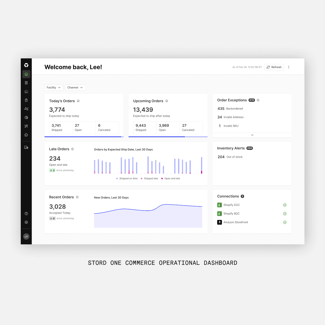 The Stord One Commerce cloud-based inventory and order management system lets you operate a high volume e-commerce and B2B business by automating workflows and managing exceptions to tracking SLAs and network-wide inventory. For the first time, get complete visibility of all your orders, products, and KPIs with a single source of truth across your entire network of systems, facilities, and partners.